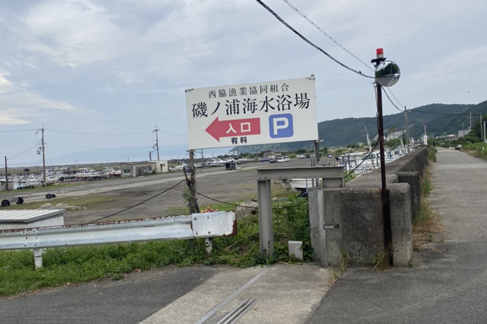 磯の浦海水浴看板見えたら左折。料金所の古屋が右手にあるので、料金所では駐車場代を払わず「遊漁船乗りに来ました」とお伝えしていただき、通過して下さい。(駐車場代は乗船料と一緒に船長が回収いたします。)